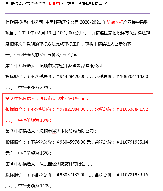 天澤木業(yè)在中國移動遼寧公司最新防腐木桿采購項目中中標(biāo)